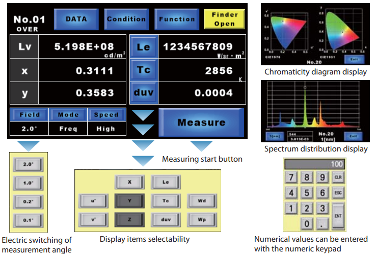 | 測量功能 | 輻射亮度 Le : W・sr-1m-2、 輝度 Lv : cd・m-2 CIE1931 色度座標 xy、CIE1976 色度座標 u'v' 三刺激値XYZ、相關色溫度(Tc;k)、 偏差(duv) 主波長 (nm)、峰值波長 (nm)、CIE 顏色系統 2° / 10° |